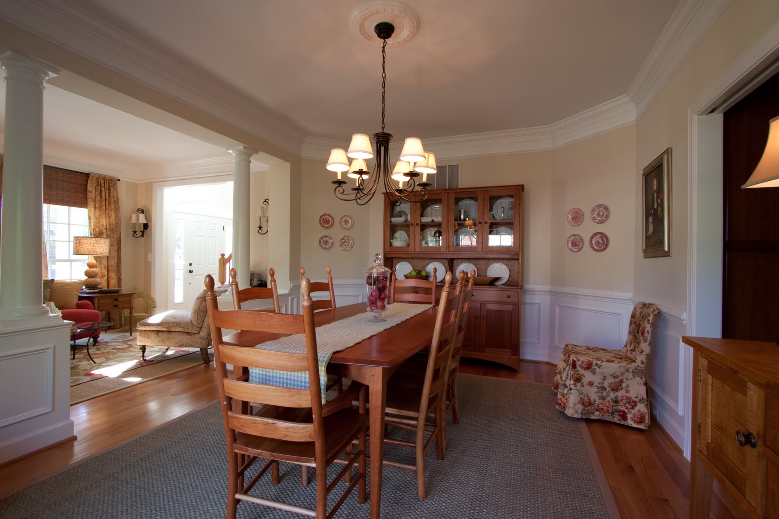 When I first arrived at Susannah's home, (below) she hadn't really done anything to her living room/ dining room yet. The other areas of her custom home are done very well, but she called me in because she wanted some help on getting these spaces pefect. She wanted a mix of vintage and new pieces, a warm palette, and a fun and aged, pretty-yet-comfortable feel. She loves a bit of old-fasioned but didn't want it to feel like grandma's house. We met & spoke at length about what Susannah was looking for. She gave me a nice big packet of inspiration photos. I went to work created a plan for the space that I thought she would love. Susannah would be handling all painting & installations, and most of the fabrications & ordering of the items specified in the plan (other than trade items). We started here: